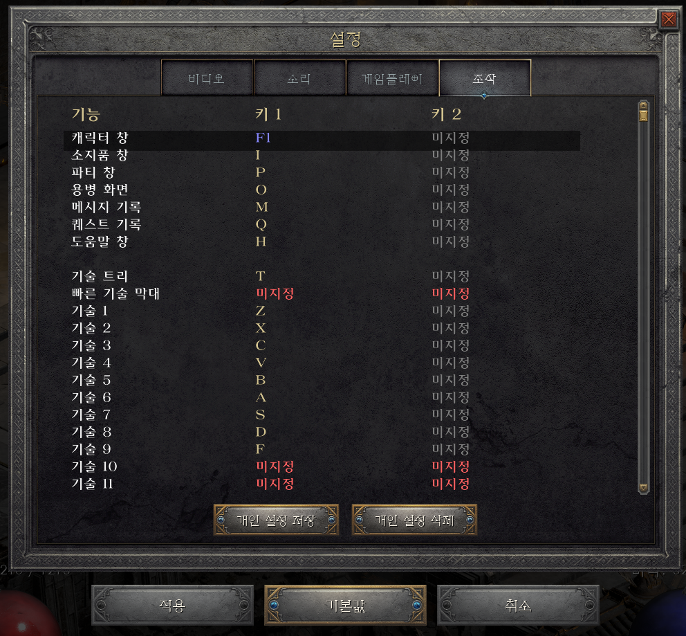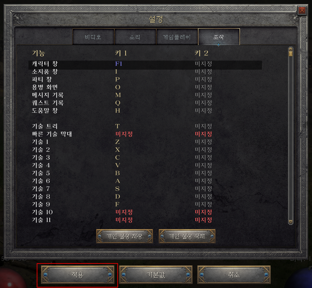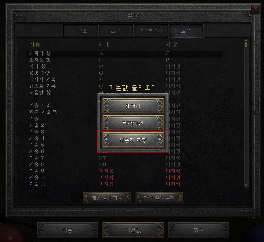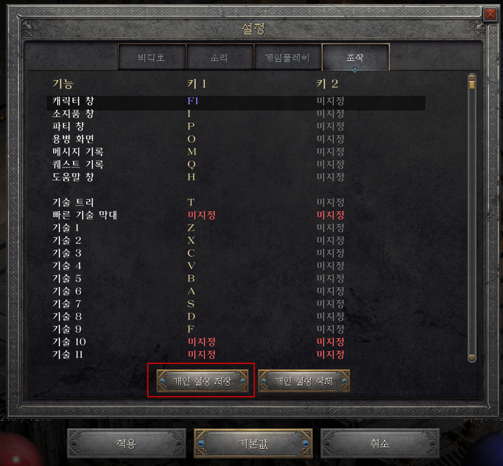 내가 바꾼 단축키를 게임 내에 저장해 두고 캐릭터마다 쉽게 적용하는 방법이 있습니다