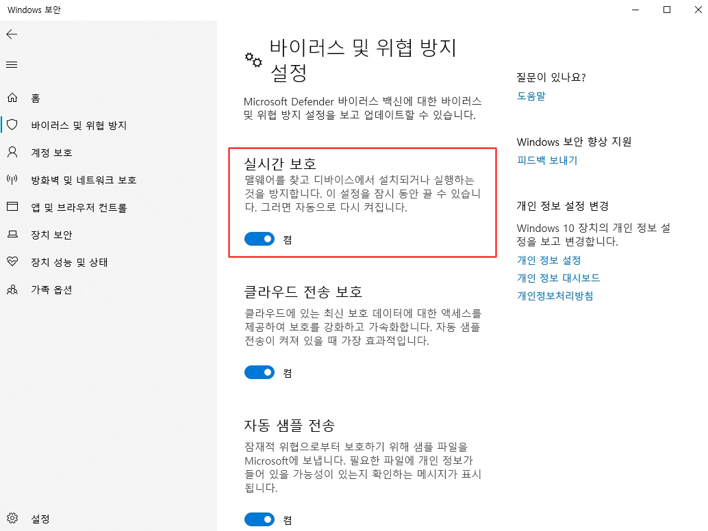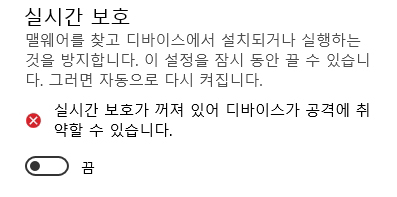 실시간 보호를 끄게 되면 내 컴퓨터는 바이러스로부터 보호를 받을 수 없게 되기 때문에 실시간 보호를 끄고 해야하는 작업이 모두 끝났다면 반드시 실시간 보호를 다시 켜주어야 합니다.