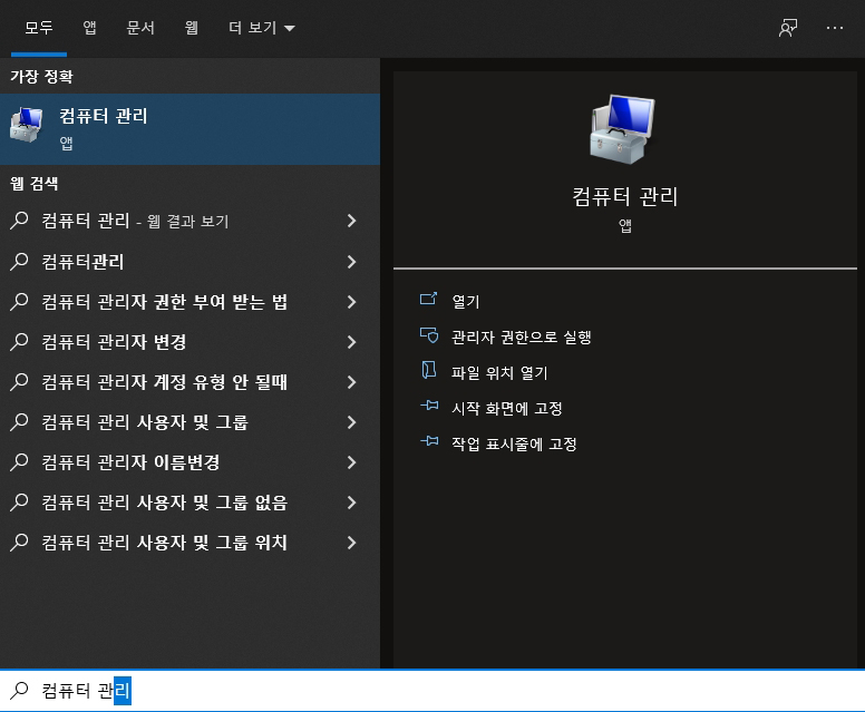 그런데 분명히 모든 작업을 종료 하였음에도 오류가 뜨는 경우도 있는데요. 그러면 다른 방법을 사용해볼 수 있어요. 작업표시줄 좌측 하단의 검색창에 "컴퓨터 관리"를 검색해 실행해주세요.