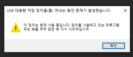그런데 가끔 usb를 pc에서 제거하려고 꺼내기 명령을 실행하면 이런 오류 문구를 볼 수 있습니다.