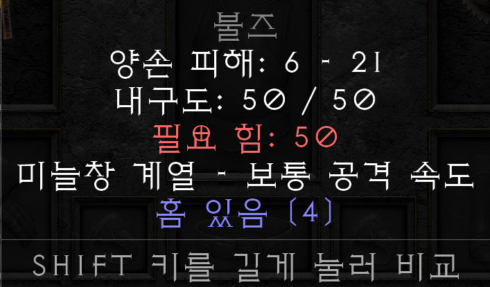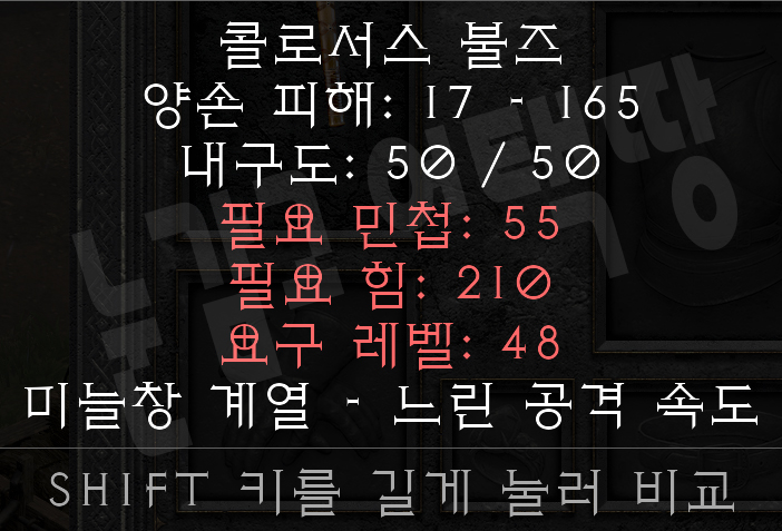 스탯 요구치를 확인 없이 만들었다가 이렇게 높은 힘제 때문에 착용도 못하고 창고에 통찰을 처박아둬야 하는 불상사가 생길 수 있으니 주의.