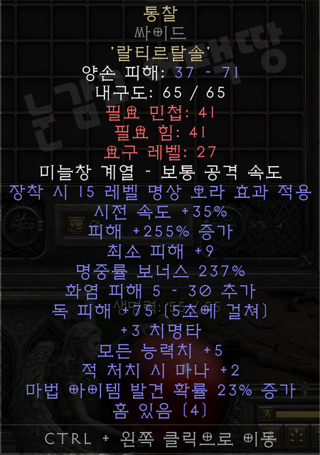 12~17 레벨 명상 오라 효과 적용 시전 속도 35% 피해 255% 증가 최소 피해 9 명중률 보너스 180~250% 화염 피해 5-30 추가 독 피해 75 1~6 치명타 모든 능력치 5 적 처치 시 마나 2 마법 아이템 발견 확률 23% 증가