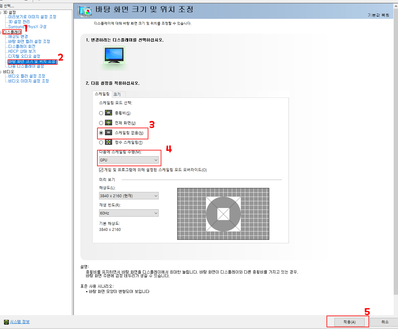 다음에 스케일링 수행은 디스플레이나 gpu 중 둘 다 사용해보시고