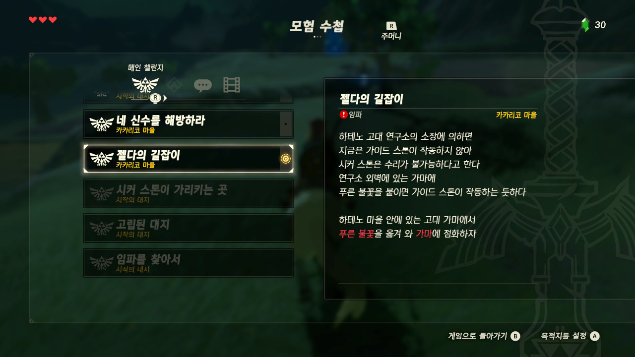 지도에 표시된 곳으로 가면 고대 가마가 있고 가까이에 가서 횃불을 들고 공격버튼을 누르면 링크가 횃불에 불을 붙입니다
