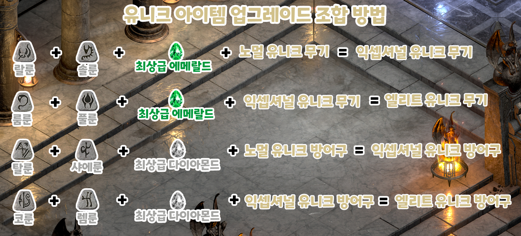 유니크 아이템 업그레이드 하기 2021.10.30 12:49 디아블로2 레저렉션 반응형 유니크 아이템 업그레이드 하기 랄룬+솔룬+최상급 에메랄드+노멀 유니크 무기=익셉셔널 유니크 무기룸룬+풀룬+최상급 에메랄드+익셉셔널 유니크 무기=엘리트 유니크 무기탈룬+샤에룬+최상급 다이아몬스+노멀 유니크 방어구=익셉셔널 유니크 방어구 코룬+렘룬+최상급 다이아몬드+익셉셔널 유니크 방어구= 엘리트 유니크 방어구 반응형 공유하기 게시글 관리 눈감고 어택땅 저작자표시 비영리 변경금지 (새창열림) '디아블로2 레저렉션' 카테고리의 다른 글 디아블로2 레저렉션 육성 초반 골드 버는법 (0) 2021.10.31 레어 아이템 업그레이드 방법 (0) 2021.10.30 비밀의 젖소방 여는 방법(카우방) (0) 2021.10.29 디아블로2 레저렉션 소켓 큐빙 (0) 2021.10.29 디아블로2 레저렉션 골드 안전하게 보관하기 (0) 2021.10.25 듀리엘이 있는 탈라샤의 무덤 찾기 (0) 2021.10.25 댓글 공유하기 다른 글 댓글 이 글 공유하기 구독하기 구독하기 카카오톡 카카오톡 라인 라인 트위터 트위터 Facebook Facebook 카카오스토리 카카오스토리 밴드 밴드 네이버 블로그 네이버 블로그 Pocket Pocket Evernote Evernote 다른 글 디아블로2 레저렉션 육성 초반 골드 버는법 디아블로2 레저렉션 육성 초반 골드 버는법 2021.10.31 레어 아이템 업그레이드 방법 레어 아이템 업그레이드 방법 2021.10.30 비밀의 젖소방 여는 방법(카우방) 비밀의 젖소방 여는 방법(카우방) 2021.10.29 디아블로2 레저렉션 소켓 큐빙 디아블로2 레저렉션 소켓 큐빙 2021.10.29 다른 글 더 둘러보기