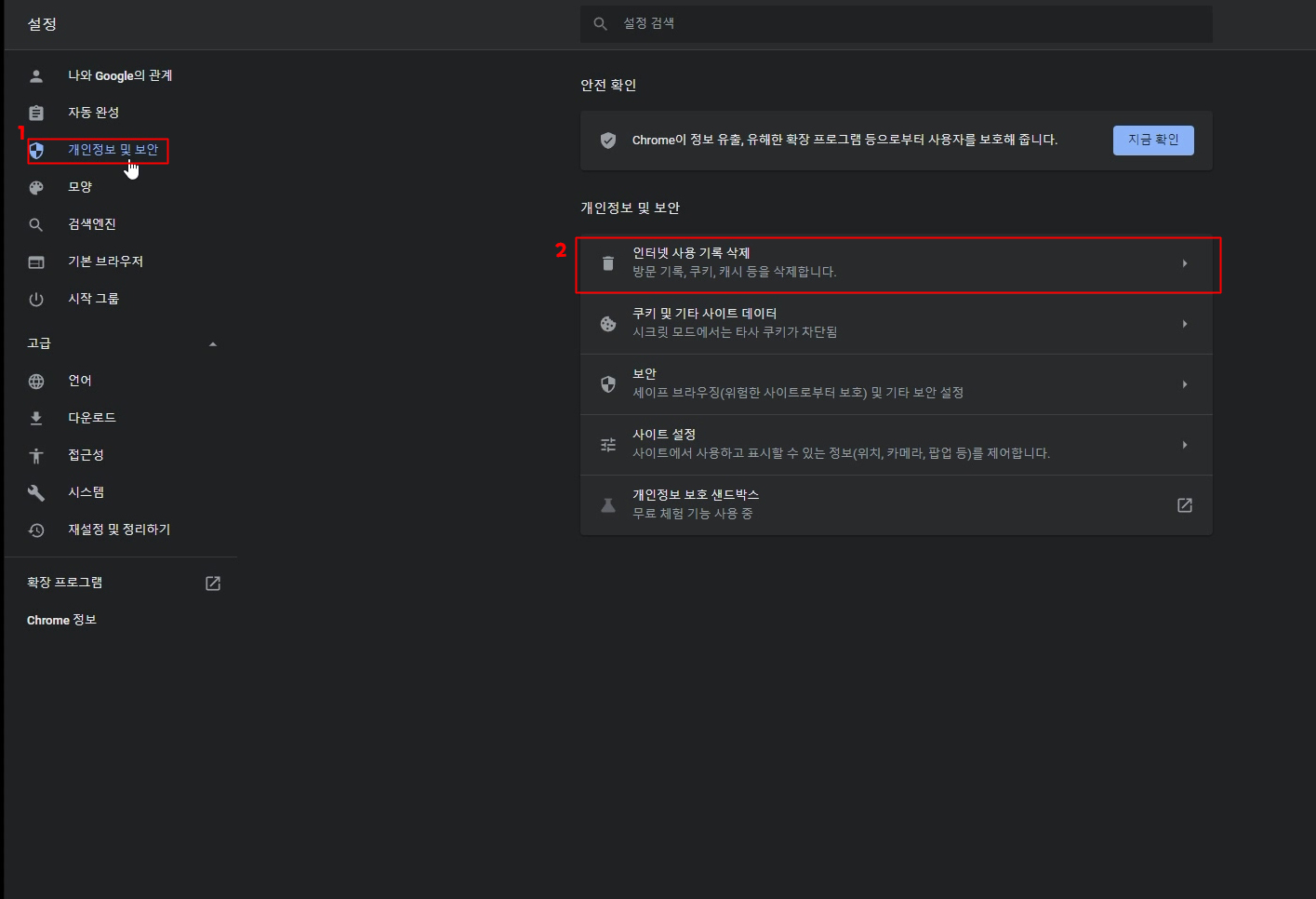 "개인정보 및 보안"탭에서 "인터넷 사용 기록 삭제"를 눌러주세요.
