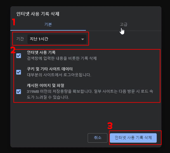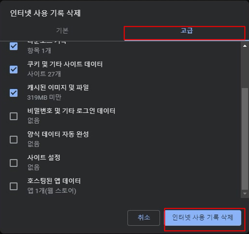 내가 지우고 싶은 기간을 선택해주고 삭제하려는 목록을 선택해 "인터넷 사용 기록 삭제"를 눌러주세요.
