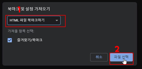 "HTML 파일 북마크하기"를 선택하고 "파일 선택"을 눌러 저장된 경로에서 북마크를 가져오시면 됩니다.