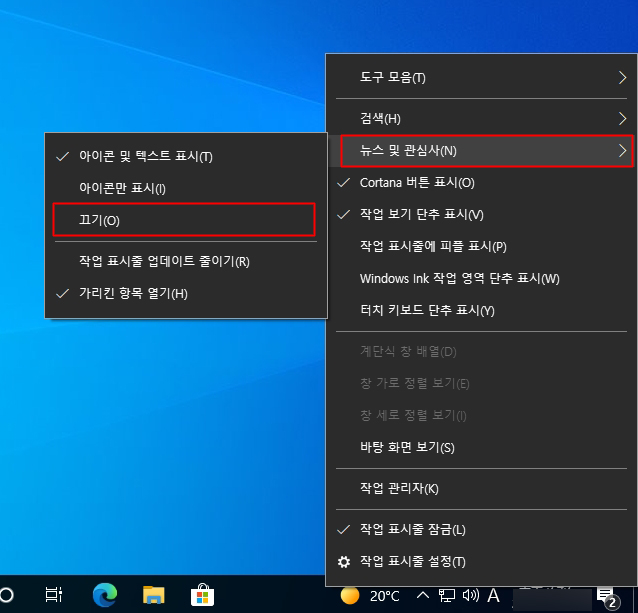 윈도우10 작업표시줄 날씨 끄기 2021.11.04 15:58 pc/유틸리티 반응형 윈도우10 작업표시줄 날씨 끄기 윈도우10을 가상윈도우로 설치 하였는데 작업표시줄에 날씨 위젯이 있습니다. 클릭하면 뉴스가 나오기도 하고 날씨도 알 수 있기 때문에 유용하신 분도 있을 테지만 저는 저 녀석이 딱히 필요 없기 때문에 끄기로 했습니다. 끄는 건 정말 간단해요. 날씨 위젯을 우클릭하고 "뉴스 및 관심사"에 커서를 올리면 나오는 끄기 버튼을 눌러주면 됩니다. 윈도우10 작업표시줄 날씨 끄기 반응형 공유하기 게시글 관리 눈감고 어택땅 저작자표시 비영리 변경금지 (새창열림) 'pc > 유틸리티' 카테고리의 다른 글 부팅 할 때 프로그램 자동 실행하기 (0) 2021.11.06 여러 프로그램 한번에 실행하기 (0) 2021.11.05 윈도우10 화면 녹화하기(xbox game bar) (0) 2021.11.05 윈도우 10 야간모드 사용하기 (0) 2021.11.04 크롬 북마크 저장하기, 불러오기 (0) 2021.11.03 크롬 방문기록, 검색기록 삭제 방법 (0) 2021.11.03 댓글 공유하기 다른 글 댓글 이 글 공유하기 구독하기 구독하기 카카오톡 카카오톡 라인 라인 트위터 트위터 Facebook Facebook 카카오스토리 카카오스토리 밴드 밴드 네이버 블로그 네이버 블로그 Pocket Pocket Evernote Evernote 다른 글 여러 프로그램 한번에 실행하기 여러 프로그램 한번에 실행하기 2021.11.05 윈도우10 화면 녹화하기(xbox game bar) 윈도우10 화면 녹화하기(xbox game bar) 2021.11.05 윈도우 10 야간모드 사용하기 윈도우 10 야간모드 사용하기 2021.11.04 크롬 북마크 저장하기, 불러오기 크롬 북마크 저장하기, 불러오기 2021.11.03 다른 글 더 둘러보기