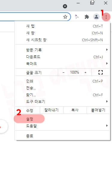 일단 크롬 브라우저를 실행해주시고 우측상단의 점이 세 개 그려진 메뉴 버튼을 눌러 설정에 들어가 주세요.