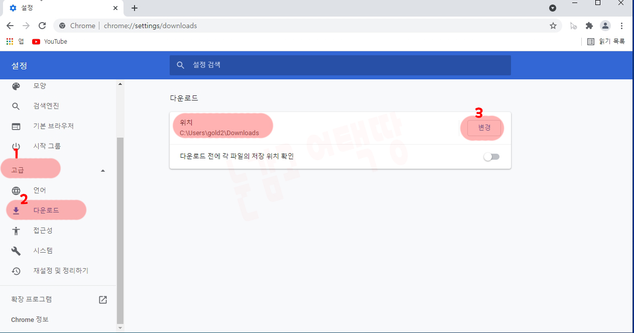 좌측 사이드바 메뉴에서 "고급"을 찾아 클릭해서 하위 메뉴를 열어준 뒤 "다운로드"를 클릭해주세요. 다운로드 설정창이 나오고 내가 크롬에서 다운로드하는 파일이 저장되는 경로가 나옵니다. 기본 설정은 다운로드 폴더로 되어있죠. 이제 "변경"버튼을 눌러 주세요.