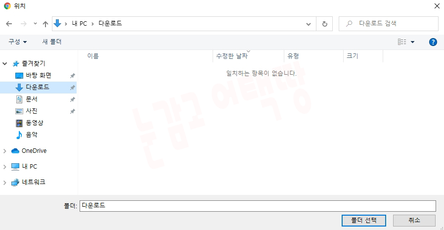 위치 설정창이 뜨면 기본 설정인 "다운로드"폴더에서 원하시는 폴더로 선택해주시고 폴더 선택을 눌러 완료해주세요.