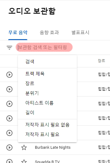 "보관함 검색 또는 필터링"란에서 장르나 제목으로 나에게 필요한 음원을 검색할 수도 있어요. 참고로 카테고리 중 저작자 표시 필요라고 표시되어있는 음원은 게시할 때 저작권자를 같이 게시해줘야 한다고 합니다.