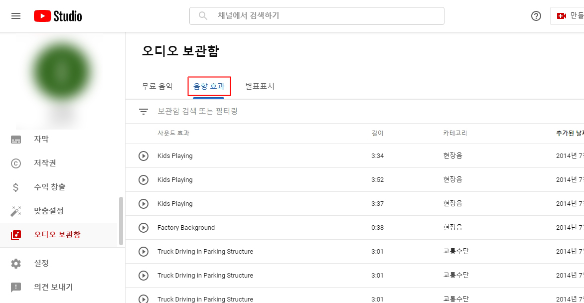 노래 음원뿐만 아니라 효과음도 "음향 효과"에서 얻을 수 있습니다.