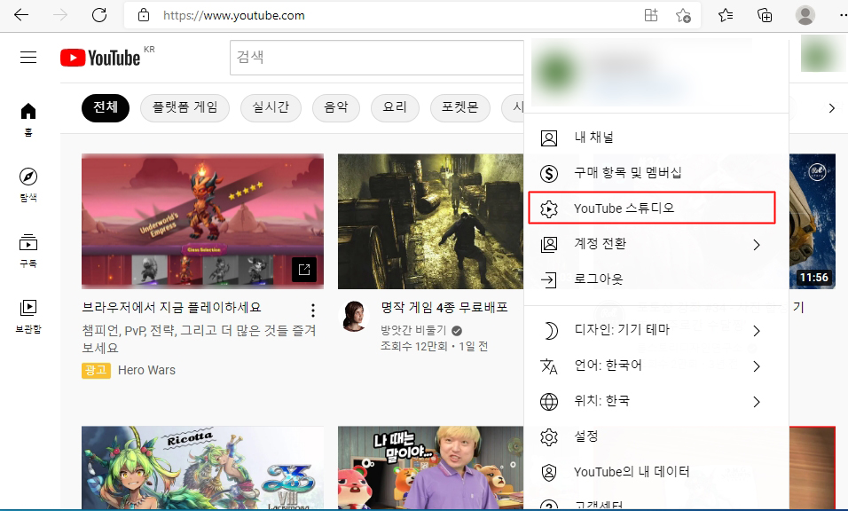 우측 상단에 있는 자신의 프로필을 눌러 메뉴바가 나타나면 "youtube 스튜디오"를 클릭해 이동해주세요.